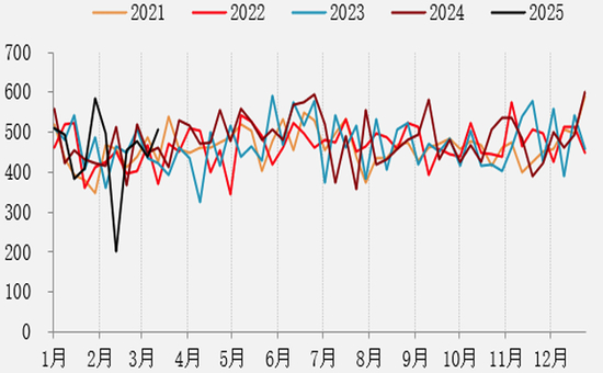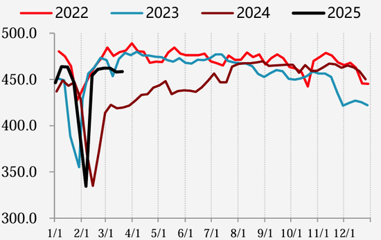 高频数据显示,2025年1月起焦煤矿开工率进入修复通道。尽管春节假期导致局部煤矿阶段性减产,但节后复产节奏显著快于往年。截至3月中旬,周度精煤产量攀升至446.32万吨,较2024年同期413.66万吨同比提升7.9%,供给弹性持续释放。