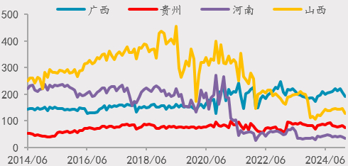 全球储采比高达65年,但是中国储采比是最低的,7年左右。在2015年矿山治理之前,山西河南等地存在滥采乱挖等现象,使得矿石品位不断降低。随后政府开展了一系列治理手段,使得开采不断正规化,但产量也不断下滑。据SMM数据统计,2024年国内铝土矿产量降低700余万吨,2024年年初以来,河南受到复垦影响,山西由于安监压力,均有铝土矿矿山出现停产。受制于矿石品位以及其他相关政策限制,其复产节奏较为缓慢,在可预见的未来,两地的矿石供应难以恢复至以往的水平。2024年11月份,三门峡市召开全市自然资源领域重点工作例会,会议指出,生态修复攻坚年工作,务必完成矿山生态修复治理任务,以目前跟踪的河南月度铝土矿产量来看,未有明显好转,预计2025年增量有限。山西吕梁铝土矿因安全事故停产后监管一直未见放松,提高集中度以降低事故率是主要目标,从相关政策文件看,最早可见批量恢复预期要到下半年。