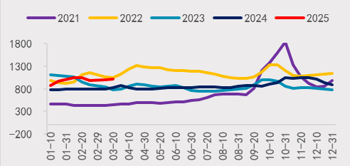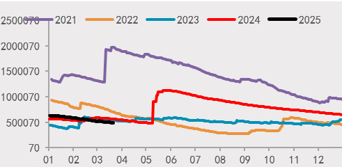 截至3月20日,周度开工率上来看,铝型材恢复至2024年同期水平,但铝板带、铝箔、铝线缆开工率还未恢复至2024年同期水平。随着二季度消费旺季的到来,开工率将进一步提升。