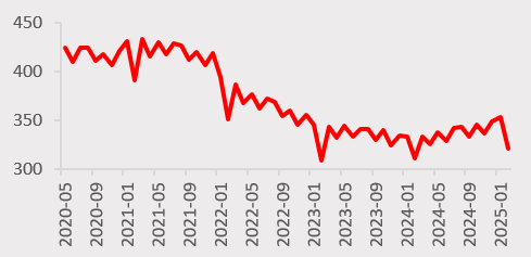 复产产能方面,因2024年氧化铝高位,广西、四川运行产能合计减量28.2万吨,四川已复产10.5万吨,还有接近18万吨复产,预计二季度复产。新增产能方面,SMM数据显示,2025年增量产能(不包含产能置换)预计为85万吨,中铝青海扩建升级、霍煤鸿骏二期、农六师搬迁扩建项目、新疆天山铝业预计2025年逐步投产,但根据投产进度,只有中铝青海项目一季度投产,其他项目投产在下半年乃至四季度。综合来看,预计2025年国内电解铝产量在4390万吨左右。