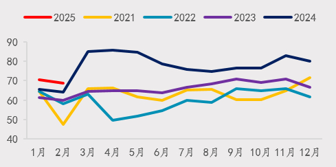 截至2025年2月份运行产能4364万吨,开工率达到95.26%。国内自从2017年供给侧改革以来,产能天花板被限定在4500万吨左右,目前运行产能已经接近产能限制天花板,未来的产能增量被限制。分地区运行产能变化来看,2月份相比于2024年底,仅青海与四川运行产能有变动,分别增加2万吨、10.5万吨。