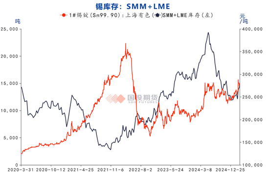 图:锡显性库存(SMM+LME)与国内现锡报价