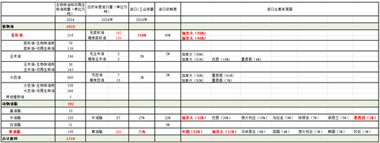5、实际上2024年企业已经超过RVO的量在生产了。2024年生物质柴油RVO为30.4亿,实际生物质柴油生产了48.6亿。如果掺混范围为47.5-55亿,比2024年生物质柴油产量48.6亿高出了-1.1~6.4亿加仑,大概对总原料的拉动在-40~232万吨,豆油需求量占比按照35%(2024年底的比例)计算,大致为-14~81万吨。