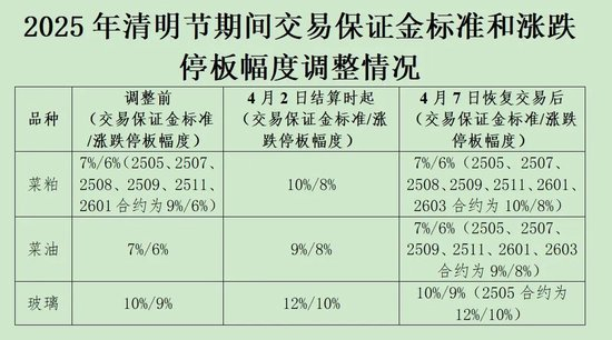 根据郑商所公告,自2025年4月2日结算时起,菜粕期货合约的交易保证金标准为10%,涨跌停板幅度为8%;菜油期货合约的交易保证金标准为9%,涨跌停板幅度为8%;玻璃期货合约的交易保证金标准为12%,涨跌停板幅度为10%。2025年4月7日恢复交易后,自品种持仓量最大的合约未出现涨跌停板单边市的第一个交易日结算时起,菜粕期货2505、2507、2508、2509、2511、2601及2603合约的交易保证金标准为10%,涨跌停板幅度为8%;菜油期货2505、2507、2509、2511、2601及2603合约的交易保证金标准为9%,涨跌停板幅度为8%;玻璃期货2505合约的交易保证金标准为12%,涨跌停板幅度为10%;上述品种其他期货合约的交易保证金标准和涨跌停板幅度恢复至调整前水平。