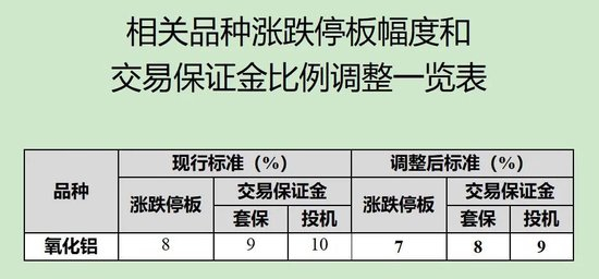 自2025年4月7日(星期一)交易后,自第一个未出现单边市的交易日收盘结算时,涨跌停板幅度和交易保证金比例调整如下: 氧化铝期货合约的涨跌停板幅度调整为7%,套保交易保证金比例调整为8%,投机交易保证金比例调整为9%; 关于涨跌停板幅度和交易保证金比例的其他事项按《上海期货交易所风险控制管理办法》执行。