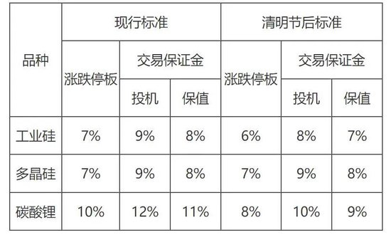 根据广期所公告,2025年清明节休市期间,广州期货交易所各品种期货合约涨跌停板幅度和交易保证金标准保持不变。请各会员单位做好对客户的风险提示工作,加强市场风险防范,确保市场平稳运行。2025年4月7日(星期一)恢复交易后,在相关品种持仓量最大的合约未出现涨跌停板单边无连续报价的第一个交易日结算时起,工业硅期货合约涨跌停板幅度调整为6%,投机交易保证金标准调整为8%,套期保值交易保证金标准调整为7%;碳酸锂期货合约涨跌停板幅度调整为8%,投机交易保证金标准调整为10%,套期保值交易保证金标准调整为9%。
