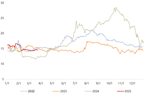 截至2025年3月,卓创资讯显示冻品库容为18.68%,处于历史同期相对偏低水平。一般来说,上半年为冻品做库存的旺季,但2025年春节后由于猪价下跌幅度有限(未跌破14元/kg),主动入库热情不高,多为被动或刚需入库为主。当前猪价绝对值偏低,部分冻品价格高于鲜品,导致冻品竞争力下降,以采购鲜品为主。冻品虽不会直接影响毛猪价格表现,但需关注低库存水平下,现货若出现大幅回落,下方存在拖底力量。