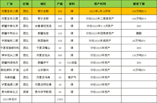 2025年,国内甲醇计划新增产能1580万吨,预计产能同比增加约15.3%,一季度内蒙古宝丰二期280万吨装置已投产,二季度内蒙古宝丰三期280万吨、新疆中泰100万吨等装置投产的可能性较大,总体看大部分投产装置配套MTO、醋酸、BDO等下游。