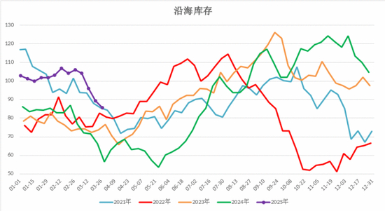 库存:沿海库存高位回落,内地维持低位。