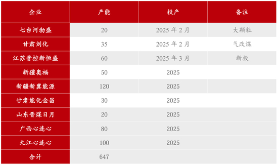 表1:2025年投产情况