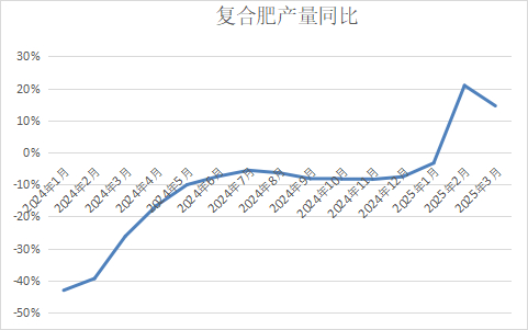 其中,农业需求增量较大。2025年化肥保供及中央一号文件等国家政策文件多次强调稳耕地面积,提高单面积产量和化肥使用效率等,预计国内耕地面积稳步增长。同时,一季度温度普遍偏高,因而农业直施跟进采购,复合肥持续去库,开工提前提高到较高位稳定,农业需求端较2024年时间提前、增量集中释放。一季度复合肥产量1575万吨,同比增长14.5%,估算农业需求同比增加53%。二季度重点关注4-5月的南方水稻追肥和备肥以及东北区域早稻和春玉米用底肥和备肥。