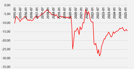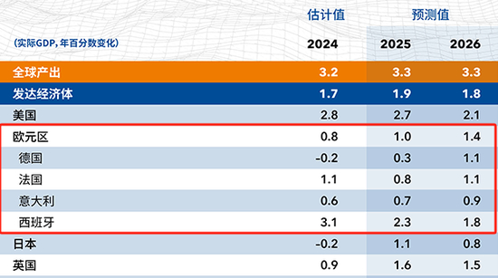 2024年欧洲经济受高利率、高通胀以及地缘政治拖累,国际货币基金组织将其GDP增速下调至0.8%,2025年经济增速预计将有所回升,但过程或慢于2024年10月的预期,主要原因在于地缘政治紧张局势持续影响市场情绪,制造业修复弱于预期叠加关税政策存在高度不确定性,2025年的增速预测值被下调了0.2个百分点至1.0%,不过较2024年出现了改善。2026年,随着金融环境趋于宽松、信心改善以及不确定因素或有所下降,欧元区需求有望走强,使经济增速上升至1.4%。