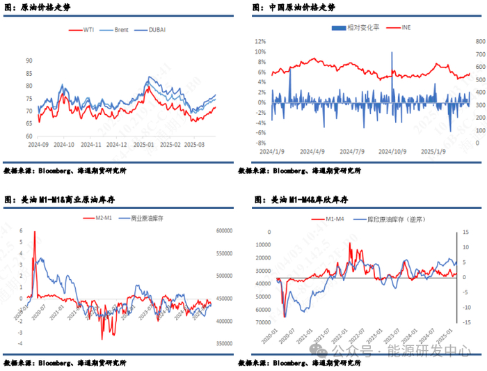 总结近期原油走势来看,本月油价的企稳回升有多方面因素构成。首先,近期美国的经济数据喜忧参半,美联储会议表态偏鸽,市场多头信心受到提振。其次,美国对伊朗的再次制裁以及对委内瑞拉的关税政策使短期避险情绪升温。同时,OPEC+也要求成员国削减石油产量,以弥补此前超出协议产量的部分,一定程度上表面了OPEC+在平衡市场供需方面的决心。地缘方面,由于俄乌冲突停战协议的前景仍不明朗,地缘政治溢价再次上升。基本面也没有大幅走弱的迹象,短期内油价仍震荡偏强。中长期来看,OPEC+大概率按照计划推进增产,补偿性减产难以落实,且市场对中长期需求放缓的担忧仍在,油价中枢预计仍然偏低。后期重点关注:1)OPEC的减产不及预期/增产-供应过剩带来的价格压力;2)美国经济数据是否进一步趋弱激化经济担忧;3)特朗普一系列的制裁和关税动作;4)地缘方面,中东地区和俄乌冲突的进程。