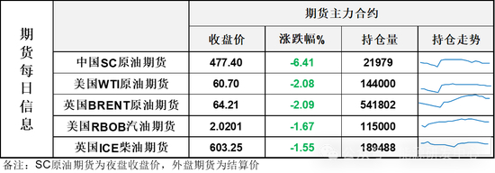 【1】WTI主力原油期货收跌6.25美元,跌幅2.08%,报60.7美元/桶;布伦特主力原油期货收跌1.37美元,跌幅2.09%,报64.21美元/桶;INE原油期货收跌6.41%,报477.4元。
