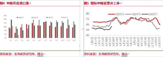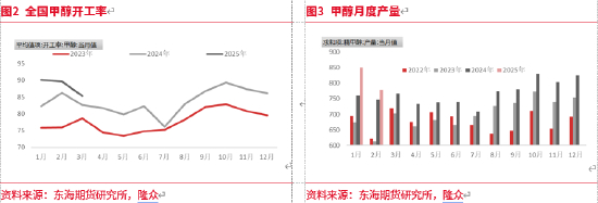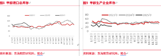 国内甲醇高开工率一方面来自于煤炭价格偏低导致成本利润偏高,较大的提升了甲醇生产积极性。另一方面,去年开始的进口下降,需要国产产量提升弥补港口供应缺口。也因此,今年春检力度继续下降。据隆众资讯数据统计,2025年2-4月春季检修涉及产能1703万吨/年,远低于往年同期检修力度。其中2月实际检修涉及产能852万吨/年,高于往年同期, 2月执行春检计划涉及产能只有381万吨/年,其他501万吨/年涉及产能多为故障性短期检修为主。3-4月目前初步统计的春检涉及产能分别只有460万吨/年、361万吨/年,是远低于往年的。预计2季度产量环比略有降低,去年二季度环比一季度减少约20万吨/月,今年预计减少幅度缩小。2季度产量整体水平仍然较高。但是需要注意的是,5-6月正值甲醇进口恢复和下游淡季前期,需求的下降和进口的补充或使得国产供应存在一定的调节,若如此,产量也有继续下降超预期的风险,需关注检修兑现情况。