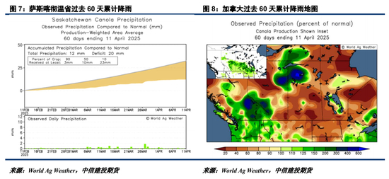 25/26年度方面,随着4月逐步进入下旬,新季加菜籽也即将迎来播种。然而,主产区萨斯喀彻温省在过去60天内的累计降雨水平不佳,这可能导致底墒较差,尤其是与2024年前期的风调雨顺情形类比,本年度加菜籽开局播种可能不太顺利。