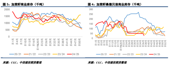 对于24/25年度而言,加菜籽商业库存压力已经不高,目前库存商品已经低于23/24年度同期,后期也有季节性回落规律。库存水平的下降表明加菜籽销售压力不高,加拿大菜籽现货及ICE盘面均有反弹潜力。不过,与美国临近的加拿大桑德贝港近期库存快速下滑,处于近年来最低水平,暗示着美加菜籽贸易有转弱的可能性。