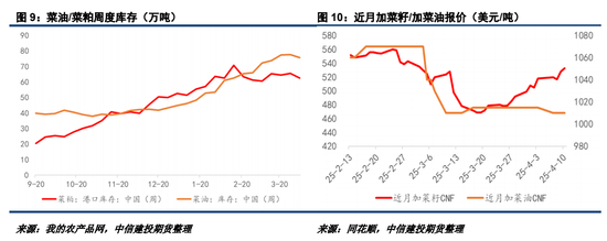 国内供需情况近期变化不大,菜系油粕均处于缓慢去库过程,菜粕受水产投苗预期带动,去库形势优于菜油。总的来说4月南方菜籽压榨供应相对充足,但远月供应转紧概率较高。近期加菜籽CNF报价也在快速反弹,我们认为在中加菜籽反倾销发布结论之前,国内产业进口心态将维持谨慎。