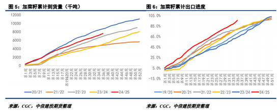 截至最新1周,加菜籽累计到货706.3万吨,同时累计出口达到717.5万吨,按照750万吨的官方出口目标,目前出口进度已经超过95%,后期上调出口目标的概率较高。目前来看欧盟市场仍有进口加菜籽的需求潜力,24/25年度加菜籽对外销售压力已经不高,结转库存悬念来自于加菜籽累计压榨最终情况。