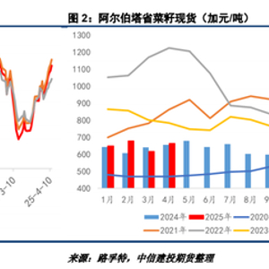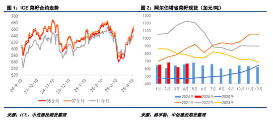 由于美加关税实施范围得到了限定,24/25年度加菜籽库存压力已经不如前期严峻,近期ICE05/07/11合约均实现快速反弹,目前报价在660/668/643加元/吨一线,接近25年2月高点水平。同时,加拿大国内现货价格实现环比上涨,阿尔伯塔省菜籽现货在630-650加元/吨左右。另外,加菜油也受到美国生物燃料掺混义务量提振影响,前期利空压力有一定缓释,下周需要关注美国相关方案落地动态。