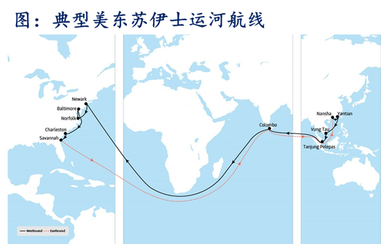 航行路径:亚洲→印度洋→苏伊士运河→地中海(当前绕行好望角)→大西洋→北美东海岸。