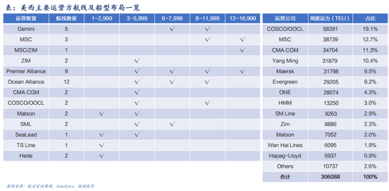 2. 市场结构:较短的运距和较少的船舶配置要求,使得美西市场除头部航司外,也有Matson、Hede等中型企业通过小型船舶(3000-8000TEU)提供快船服务。目前共有18家航司运营45条航线。