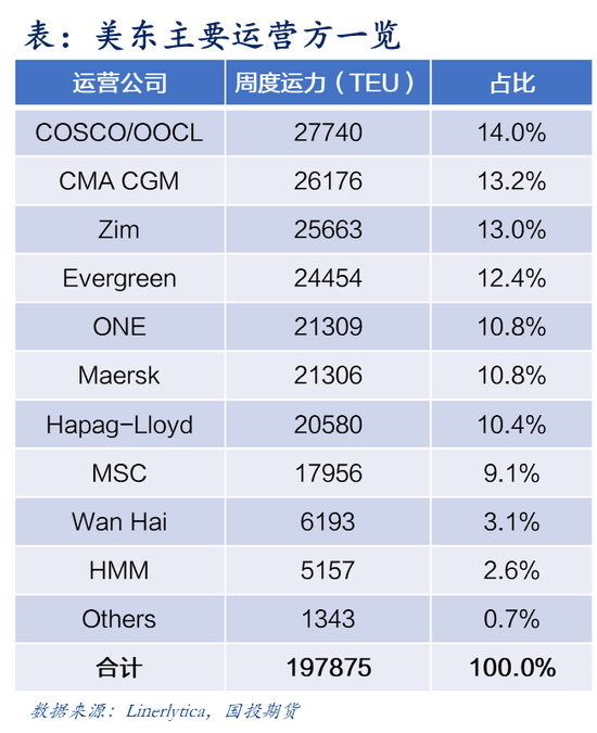 美东航线相对较远,即便选择航距最短的巴拿马运河航线(11400海里),其航程仍较美西基准航线(6000海里)近乎翻倍,若绕行好望角更将航距拉长至14000海里。运距的增加也直接抬高了运营门槛——单条航线需配置12-14艘超大型集装箱船才能维持周班服务,船舶平均吨位11000TEU,绝大部分船是8000+TEU级以上的大船。在此背景下,美东航线数量和运营商明显少于美西航线,目前的23条航线由12家运营商掌控,周度运力约20-22万TEU左右,除了中远、达飞、长荣等头部企业外,以星、万海等区域强者也参与其中。