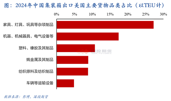 家具、灯具等杂项制品高居榜首,其余主要货物类型包括机电设备、塑料橡胶制品、金属制品及纺织品等。观察货物品类可见,我国对美集装箱海运业务仍主要服务于消费零售品、工业制造业中间品等。