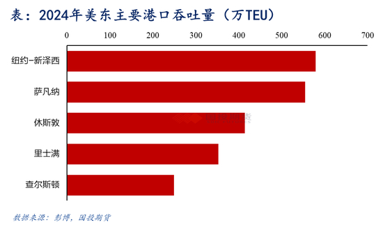 就美国本身而言,美西航线凭借地理邻近优势,长期占据进口量60%以上。不过近10年来美东港口占比逐渐上升,美国人口集中在东部地区,美东港口更贴近主要消费市场,近年来美东港口持续扩建,且在2016年巴拿马运河扩建完工后,允许最大不超过17000TEU的集装箱船通过,港口借此承接原本需经美西转运的货物,减少内陆运输成本,尤其是在2021-2022年美西港口因疫情和工人罢工出现了严重拥堵,美东进口量占比明显上升。但在2024年因巴拿马运河低水位,和美东工人罢工危机的影响,美东占比有所下降。