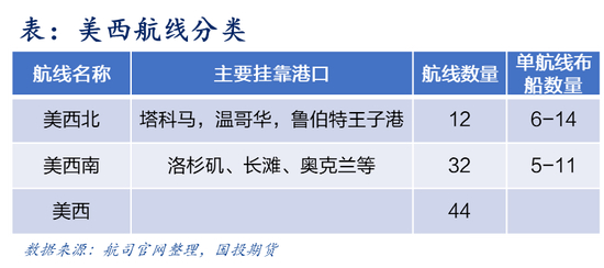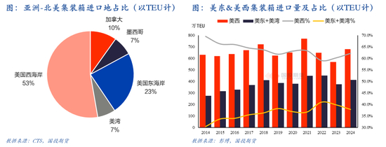 美线航线网络主要分为美西和美东两大航线。其中美国西海岸的进口量占比达到53%,东海岸(包括美东和美湾)占比达到30%,加拿大和墨西哥则分别占比10%和7%。