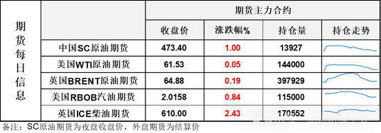 【1】WTI主力原油期货收涨0.03美元,涨幅0.05%,报61.53美元/桶;布伦特主力原油期货收涨0.12美元,涨幅0.19%,报64.88美元/桶;INE原油期货收涨1%,报473.4元。