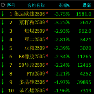 早盘收盘,主力合约多数下跌。鸡蛋涨近3%;沪金涨超2%,沪银涨近1%。跌幅方面,集运欧线、菜粕跌超3%,焦煤、豆二、豆粕、PTA、BR橡胶、20号胶跌超2%。