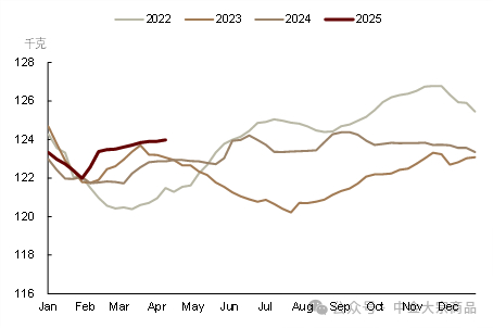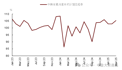 短期供给=商品猪出栏量(出栏量、压栏/二育)*出栏体重。从商品猪出栏情况看,据Mysteel样本监测,2025年3月,我国生猪出栏量为1251.68万头,同比增长21.48%,环比增长21.02%,均呈现增长趋势。据卓创资讯数据,3月生猪出栏量同比增加27.02%,且3月样本企业出栏计划完成率达到105.30%。从出栏体重看,据Mysteel样本数据,截至3月底,我国商品猪出栏平均体重为123.9kg/头,环比增加0.3%,同比增加0.9%,处于近三年最高水平。