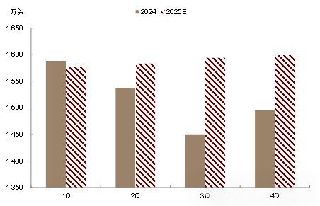 2025年1-2月,新生仔猪数量连续增加,三季度供应压力或逐步显现。新生仔猪方面,据Mysteel样本数据,截至2025年2月,新生仔猪数量为534.22万头,环比小幅增加0.45%,同比大幅增加12.3%,实际上,2025年1月和2月份新生仔猪数的增长,正对应着2024年8月后能繁母猪存栏量的环比增长,按照产能周期推算,我们认为去年新增能繁母猪产能或在1H25持续释放仔猪供应量,对应2H25生猪出栏量或连续增长。从仔猪价格来看,2025年以来,仔猪价格震荡上行,可以看到市场补栏意愿较强,虽然短期猪价行情不佳,但养殖主体对Q3行情仍较为看好,按此推算,随着产能持续兑现,Q3供需矛盾或有所强化,我们认为三季度猪价或同比明显回落(假设需求增速维持季节性)。