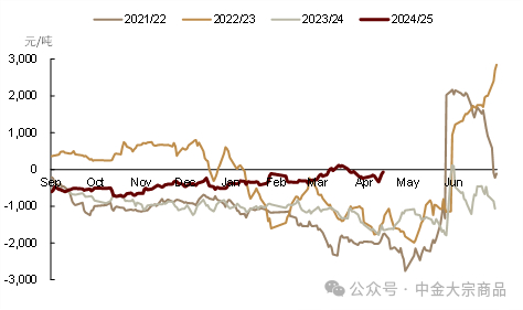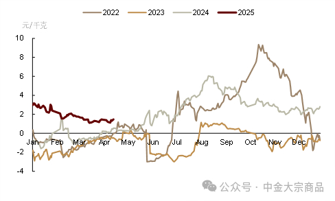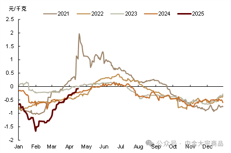 DCE2505、2507合约价格深度贴水现货,反映出市场对于二季度行情的悲观预期。我们提示,当前基本面利空预期交易较为充分,盘面底部支撑较强。目前,若二季度国内需求超预期或对现货价格形成支撑,盘面价格或有向现货价格收敛的可能性,需持续关注消费端数据。此外,5-7合约月间价差接近平水,也反映了中长期供给充裕的基本面预期,我们认为,若供给压力如期兑现,近强远弱下5-7价差或持续为正,且有走扩的可能性。
