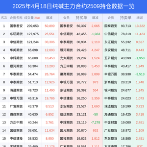 新浪期货 根据交易所数据,截至4月18日收盘主力合约纯碱2509,涨跌-2.29%,成交量96.49万手,持仓数据显示前20席位呈现净空,差额头寸为145669手。