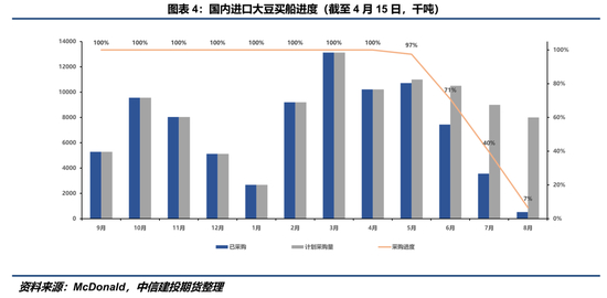 尽管海外市场对出口的担忧引致CBOT大豆反弹,但这一效应基本被南美CNF报价下跌抵消,国内进口成本未显著抬升。4-5月巴西大豆月均到港量预计达1000万吨以上,压制现货价格。华东及华南地区豆粕现货价格月度下跌约200-250元/吨,目前在3100-3150元/吨区间,反映市场对供应宽松的预期。中期来看,CNF报价下跌会吸引全球买家集中采购南美大豆,加快消耗库存,进而减缓价格向下压力。上周(0409-0415)中国国内新增24/25年度大豆采购约550万吨,目前6月之前的船期基本采购完成。近期阿根廷和巴西大豆销售主要对应国内二至三季度买船,四季度买船并未覆盖。如果全球大豆买家持续进口南美大豆,可能会导致四季度国内进口大豆供应紧缺,届时或推升国内大豆进口成本。