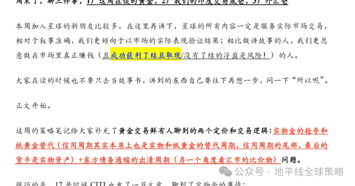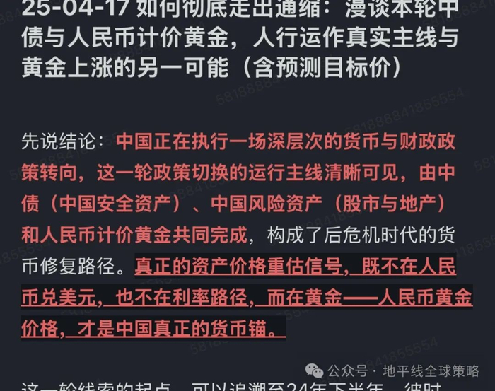 Notes250417 如何彻底走出通缩:货币锚与资产价格重构信号,漫谈本轮中债与人民币计价黄金,人行运作的真实主线与黄金上涨的另一种可能(含预测目标价)全文回答了这样一个问题:事实是,人民币计价黄金才是这一轮通缩出清的关键定价锚。真正的关键不在汇市,而在金市。全文星球内自取,写到了我们按照上海金定价的预期目标这周末星球也以我们一季度的交易聊到了宏观交易如何真正落地的问题..一季度我们成功在最高点做空美股,在黄金突破关键点入场吃到全程涨幅,成功做了美元瑞郎、美元日元两组货币对...也成功完成了两轮冲击底部对印度的配置...