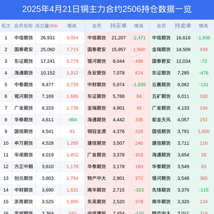 新浪期货 根据交易所数据,截至4月21日收盘主力合约2506,涨跌+1.71%,成交量12.25万手,持仓数据显示前20席位呈现净空,差额头寸为1466手。