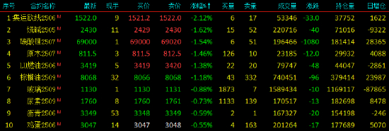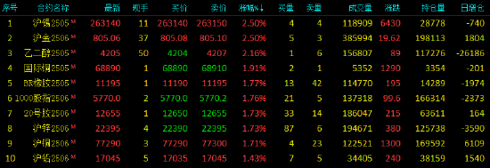 2025年4月21日,国内期货主力合约涨多跌少。沪金、沪锡、乙二醇涨超2%,国际铜、沪锌、沪铜、BR橡胶、20号胶涨超1%;跌幅方面,集运欧线超2%,烧碱、碳酸锂、低硫燃料油(LU)、原木、棕榈油跌超1%。