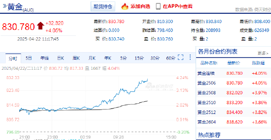 2025年4月22日,上期所黄金期货主力合约突破830元/克关口,日内涨幅超4%,为连续第十二个交易日上涨,续创历史新高。