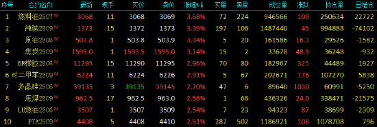 2025年4月23日,国内期货主力合约涨多跌少。燃料油、SC原油、焦炭、纯碱、丁二烯橡胶涨超3%,PX、PTA、低硫燃料油(LU)、焦煤、玻璃涨超2%;跌幅方面,沪金跌超4%,红枣、生猪跌近1%。