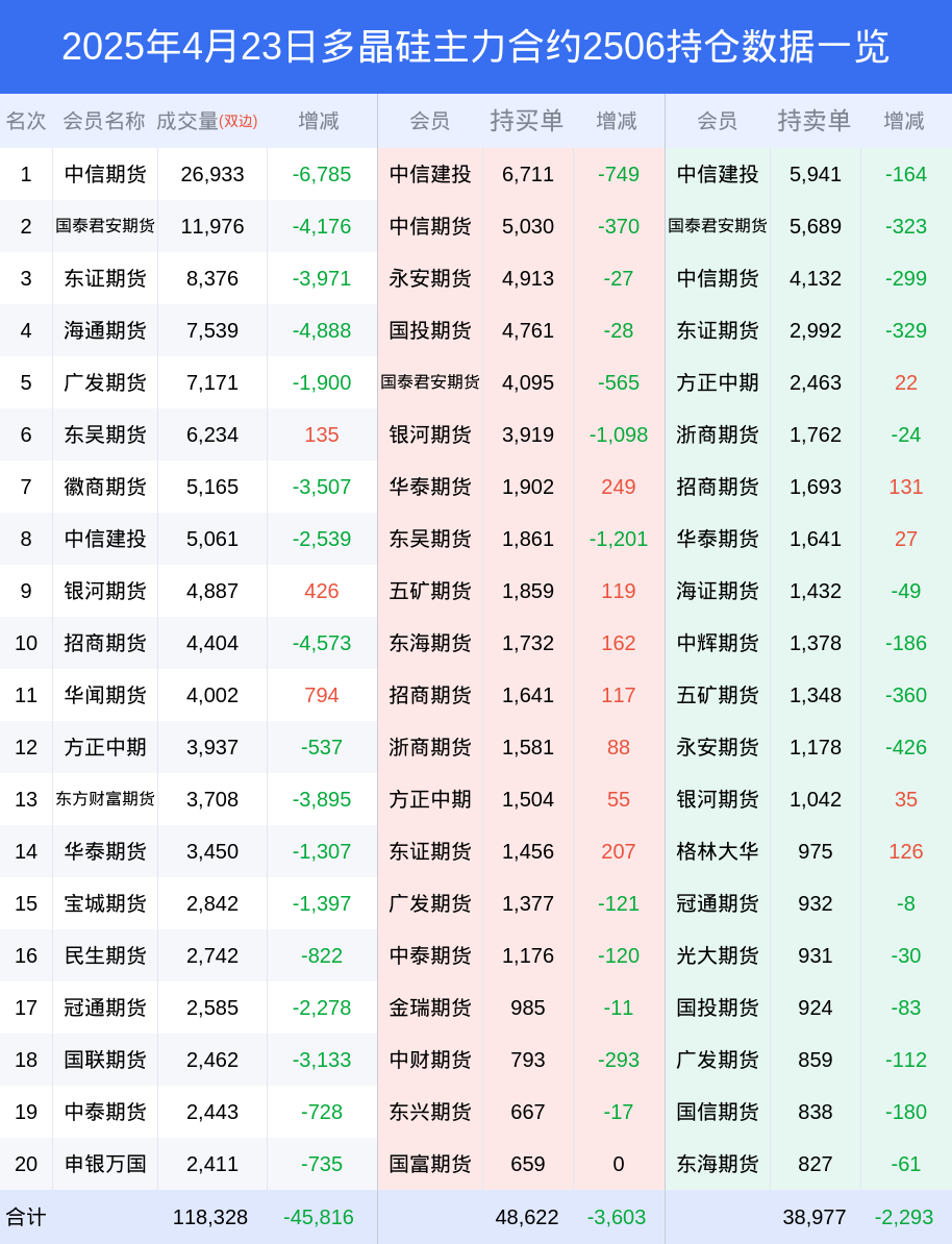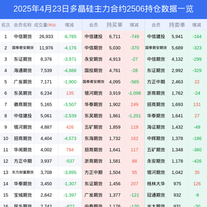 新浪期货 根据交易所数据,截至4月23日收盘主力合约多晶硅2506,涨跌+2.70%,成交量8.96万手,持仓数据显示前20席位呈现净多,差额头寸为9645手。