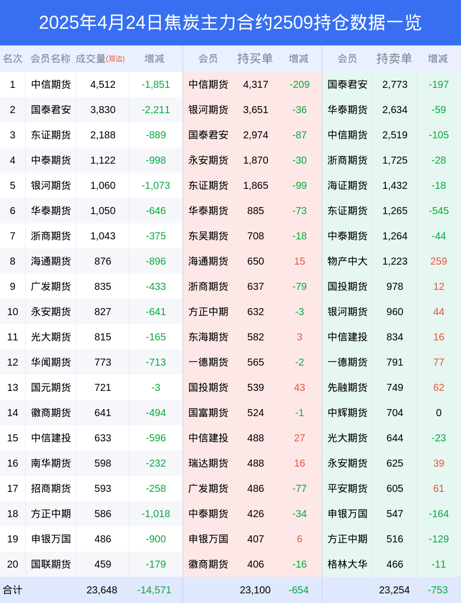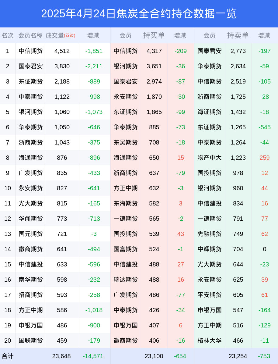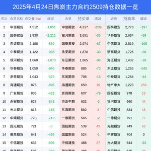新浪期货 根据交易所数据,截至4月24日收盘主力合约焦炭2509,涨跌+1.56%,成交量1.96万手,持仓数据显示前20席位呈现净空,差额头寸为154手。