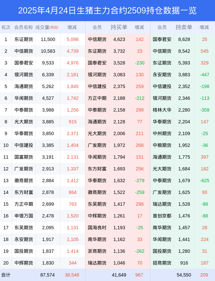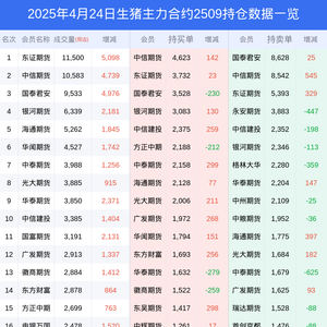 新浪期货 根据交易所数据,截至4月24日收盘主力合约生猪2509,涨跌-1.74%,成交量7.23万手,持仓数据显示前20席位呈现净空,差额头寸为12901手。