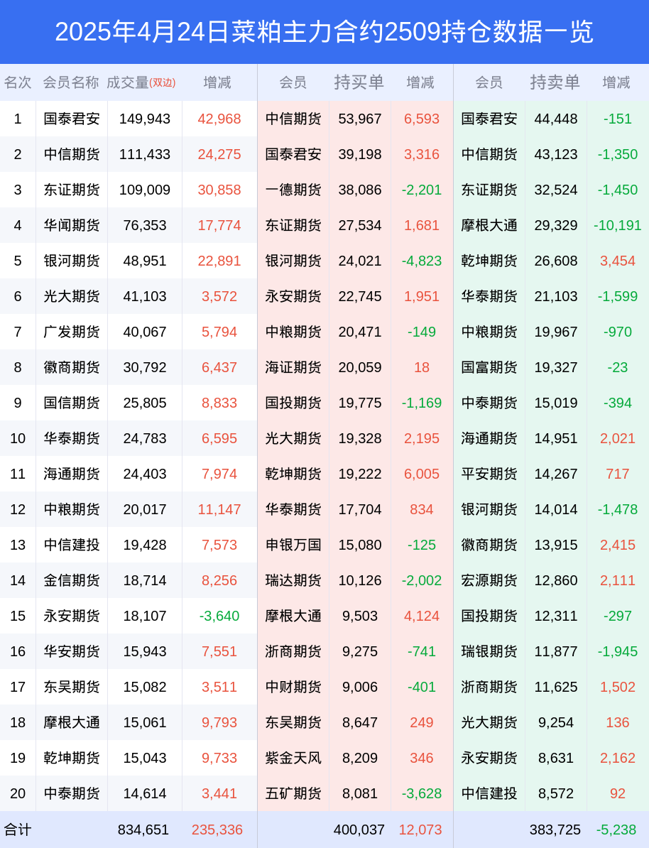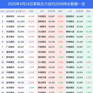 新浪期货 根据交易所数据,截至4月24日收盘主力合约菜粕2509,涨跌+2.10%,成交量63.97万手,持仓数据显示前20席位呈现净多,差额头寸为16312手。