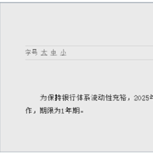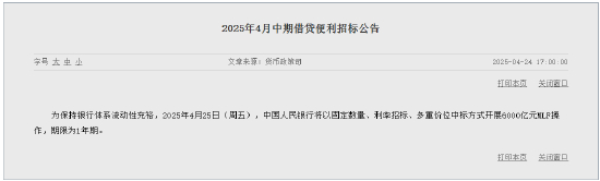 央行今日进行6000亿元1年期MLF操作 市场资讯 2025.04.24 17:08 期货K线图 央行公告,为保持银行体系流动性充裕,2025年4月25日(周五),中国人民银行将以固定数量、利率招标、多重价位中标方式开展6000亿元MLF操作,期限为1年期。