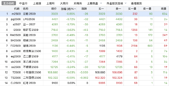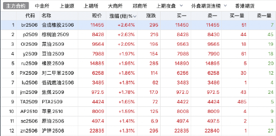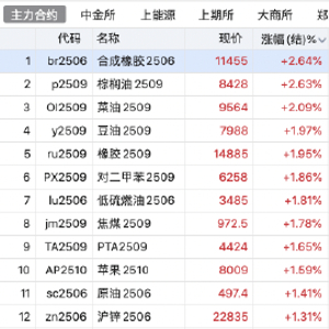2025年4月25日,早盘收盘,国内期货主力合约多数上涨。丁二烯橡胶、棕榈油、菜油涨超2%,橡胶、豆油、PX、焦煤、PTA、低硫燃料油(LU)主力合约涨超1%;跌幅方面,豆粕、豆一、液化石油气(LPG)跌近1%。