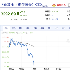 急速下挫,现回落至3290美元/盎司下方,截至发稿时,日内跌幅已达1.67%