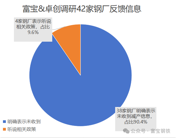 富宝小编们第一时间收到相关消息就迅速对全国各大钢厂展开了电话调研,合计共调研42家样本钢厂信息反馈,其中有4家刚才表示听说过相关政策,主要是中钢协相关倡导文件,发改委以及工信部并未发布具体红头文件。其余38家钢厂表示从未收到过相关政策发布。